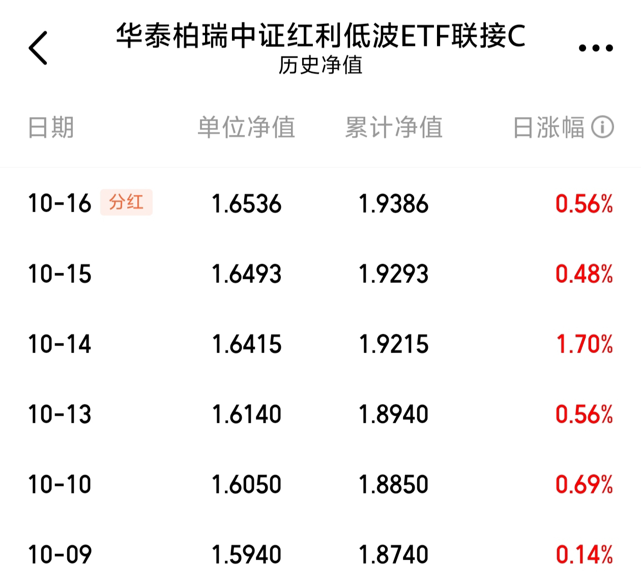 $华泰柏瑞中证红利低波ETF联接C$ 连续7天上涨,今天估值再涨0.35%,在震荡市里显得格外珍贵。