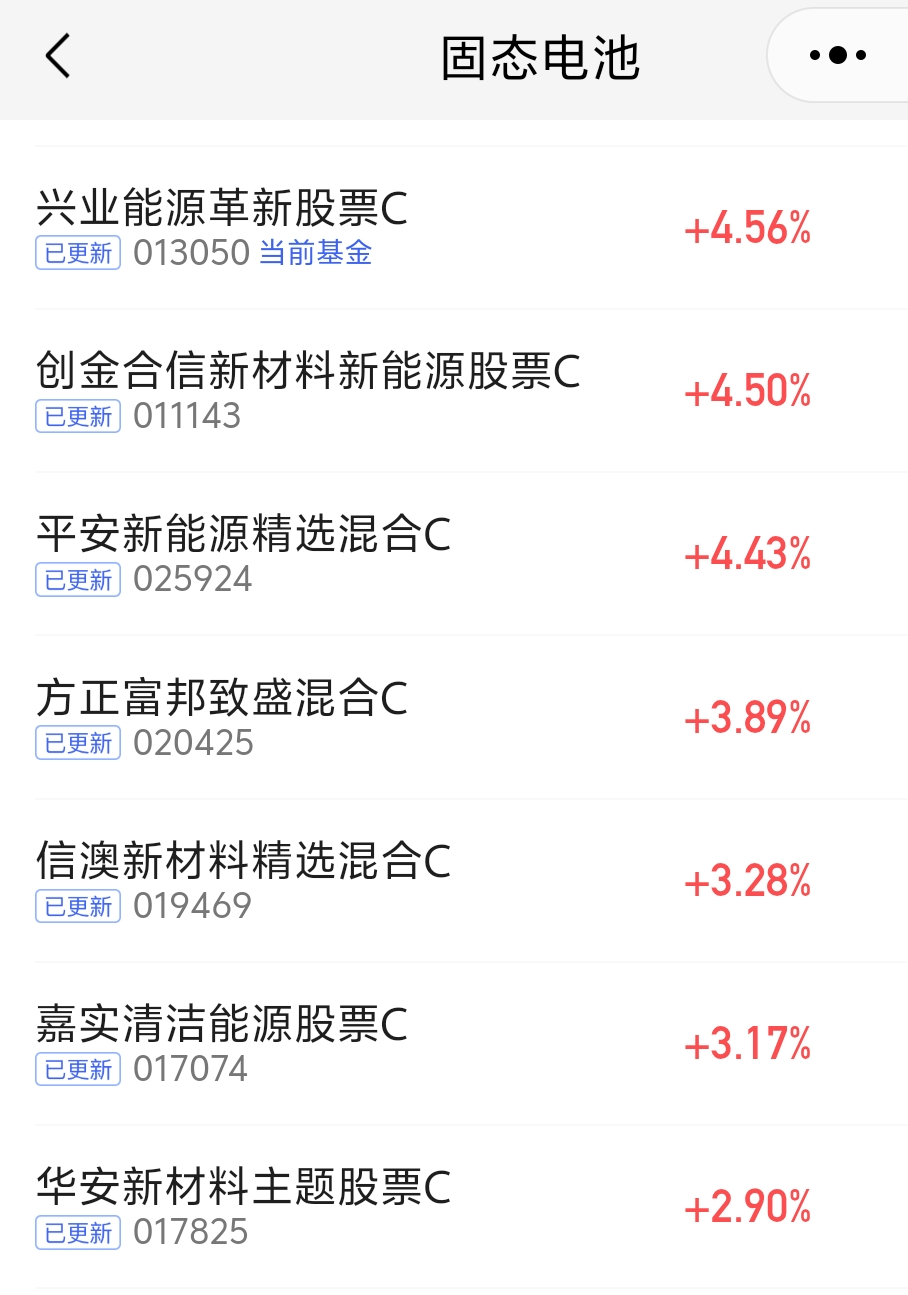 大盘今天回暖上涨,固态电池板块今天表现还不错呢,涨了不少呢,兴业能源革新股票C持仓聚焦固态电池,今天涨了4.56%,太给力了!