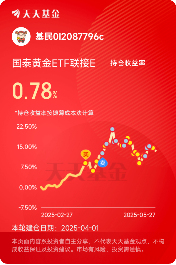 展望未来,我对黄金市场充满信心。随着全球经济的不断发展和变化,黄金作为一种稀缺的贵金属,其价值将持续得到认可。无论是作为资产配置的重要组成部分,还是应对市场不确定性的有效工具,黄金都将发挥不可替代的作用。我将继续坚定地持有并定投国泰黄金ETF联接E,以平和的心态面对市场波动,用时间的力量实现资产的稳健增长,与黄金一同驶向财富的彼岸。