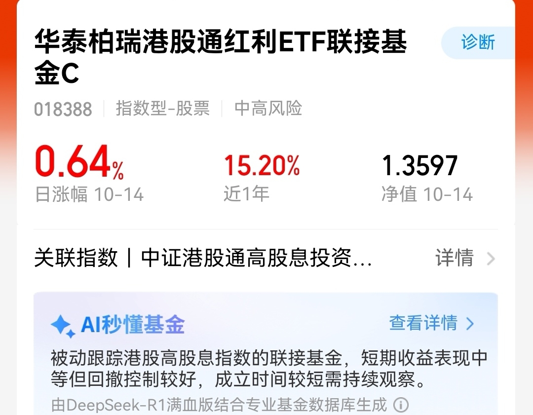 继续拿住,$华泰柏瑞港股通红利ETF联接基金C$ 今天涨了0.64%,在波动市中能保持正收益真不错,低位的港股红利确实值得关注。