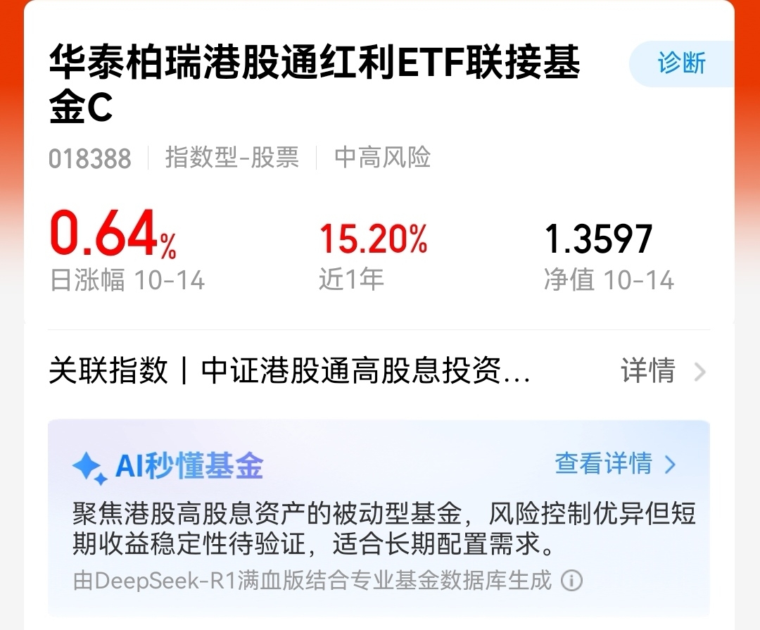 $华泰柏瑞港股通红利ETF联接基金C$ 近6个月超16%的回报真不错,今天估值又涨0.45%。波动市中,这类资产的防御性和季节性优势双双显现。