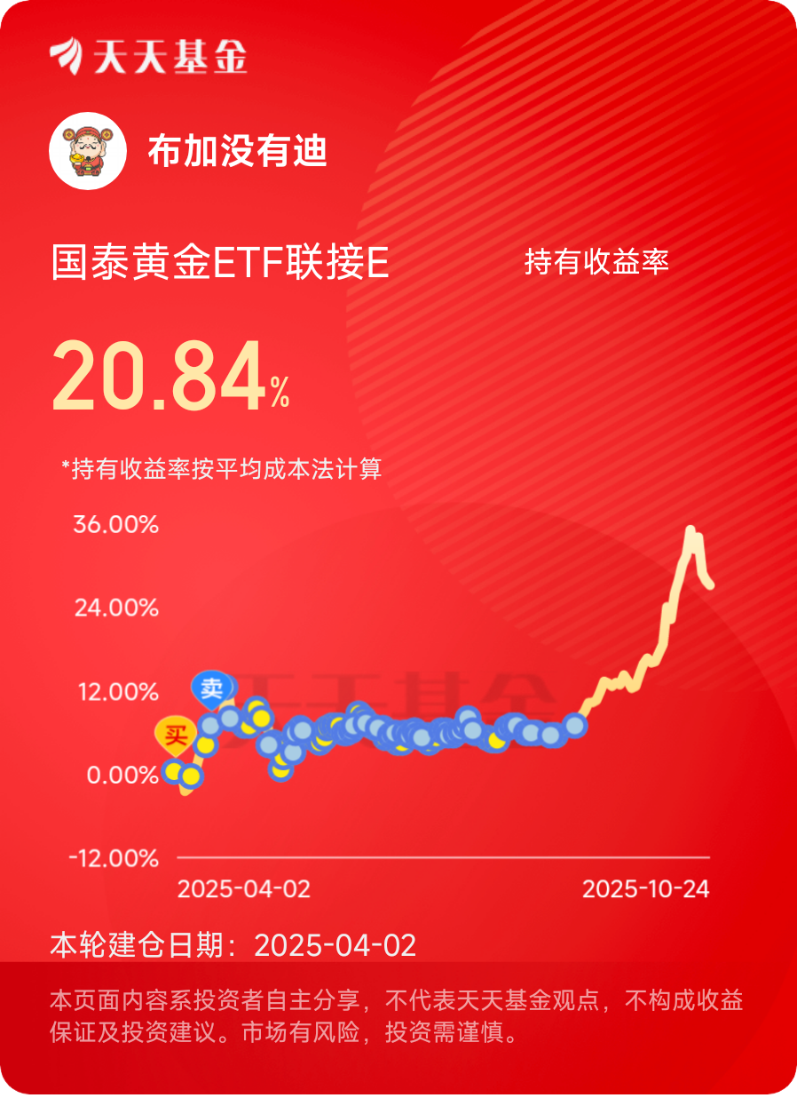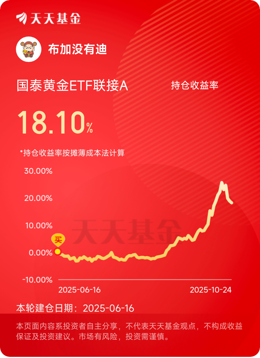 市场的波动永远是投资者的“试金石”,此次金属板块的回调,不仅没有让我退缩,反而让我更加清晰地看到了黄金与有色金属板块的长期投资价值,也更加坚定了对国泰黄金ETF联接A与国泰黄金ETF联接E的信任。未来,我将继续以长期持有为锚,以坚持定投为帆,在金属板块的投资航程中,从容应对市场波动,耐心等待价值兑现,让这两只优秀的产品,为我的资产配置版图保驾护航。@国泰基金 #晒收益#