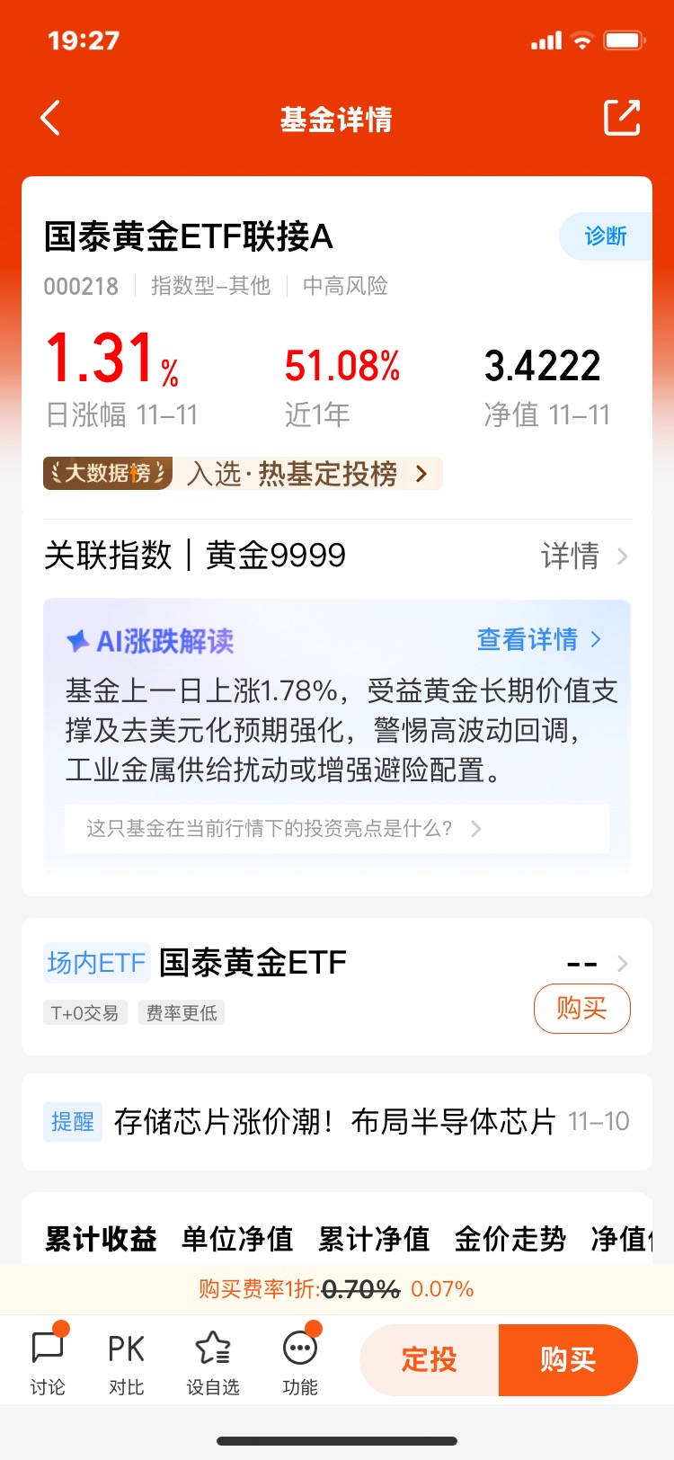 现在,我想重点$国泰黄金ETF联接A(OTCFUND|000218)$。这支基金是一只指数型基金,跟踪的是黄金价格指数,对我来说,它是个便捷的投资工具,尤其适合初入职场的人。首先,从管理团队和产品矩阵来看,国泰基金作为老牌基金公司,拥有丰富的资产管理经验和稳定的产品线,这为$国泰黄金ETF联接A(OTCFUND|000218)$提供了强大的后台支持。基金产品底层资产主要配置在黄金现货或相关衍生品上,业绩比较基准通常是上海金价或类似指数,这意味着它紧密跟随金价波动,透明度高,避免了主动管理基金可能带来的风格漂移风险。