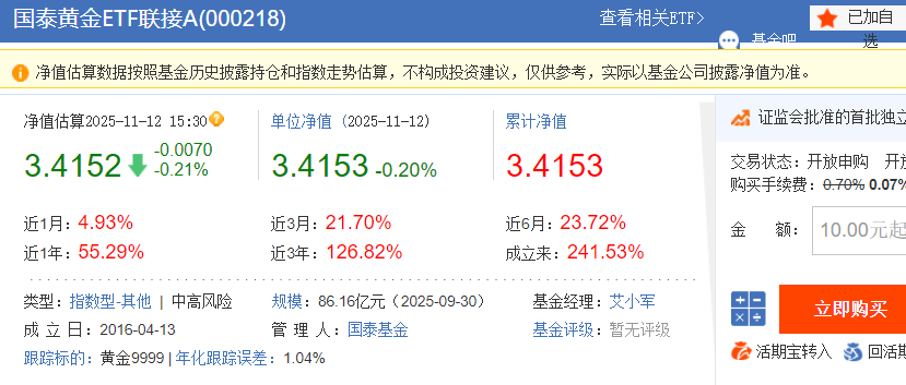 国泰黄金 ETF 联接 A(000218)与 C(004253)作为跟踪黄金资产的优质工具,具备三大核心价值:一是跟踪精准度高,年化跟踪误差不足 0.35%,能有效捕捉金价涨幅;二是费率结构灵活,A 类适合长期配置,C 类适配短期交易,满足不同投资者需求;三是管理人实力雄厚,基金经理艾小军的专业能力与国泰基金的被动投资经验提供双重保障。