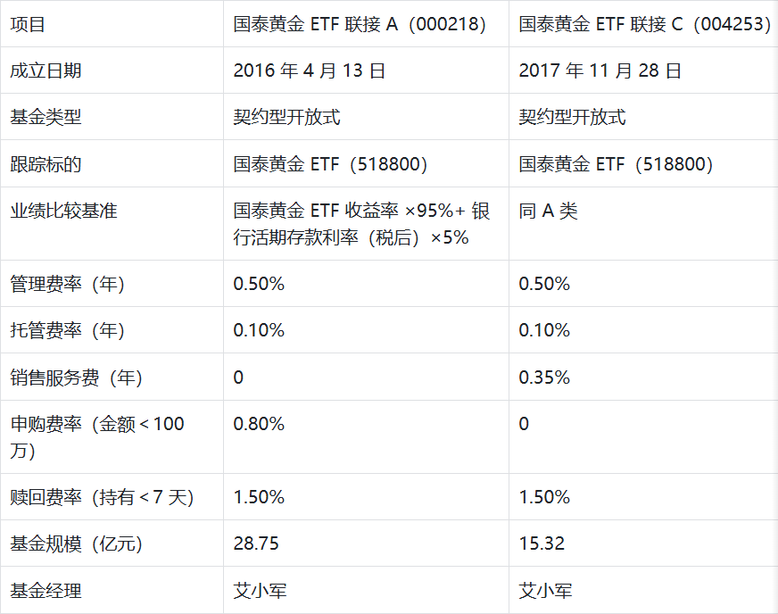 国泰黄金 ETF 联接基金分为 A、C 两类份额,均以国泰黄金 ETF(518800)为跟踪标的,通过投资 ETF 实现对黄金价格的紧密跟踪,为普通投资者提供低成本参与黄金投资的渠道。