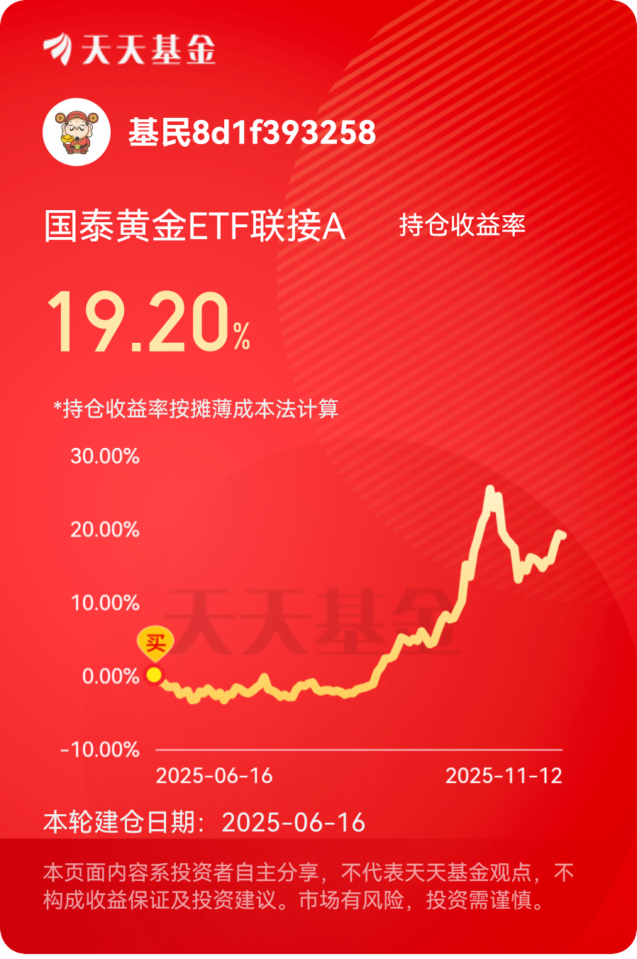 从业绩表现来看,这只基金的实力毋庸置疑。近一年涨幅超50%,近三年年化收益表现亮眼,成立以来累计回报更是翻倍,在市场震荡中展现出极强的抗跌性与盈利能力。对我而言,它不仅是分享黄金牛市的优质工具,更是平衡组合风险的关键配置。未来,在美元信用波动、全球避险需求持续的大环境下,黄金的长期价值依然稳固,我会继续坚定持有国泰黄金ETF联接A,以长期投资心态应对短期波动,让这份“黄金资产”为财富保驾护航。@国泰基金 #晒收益#