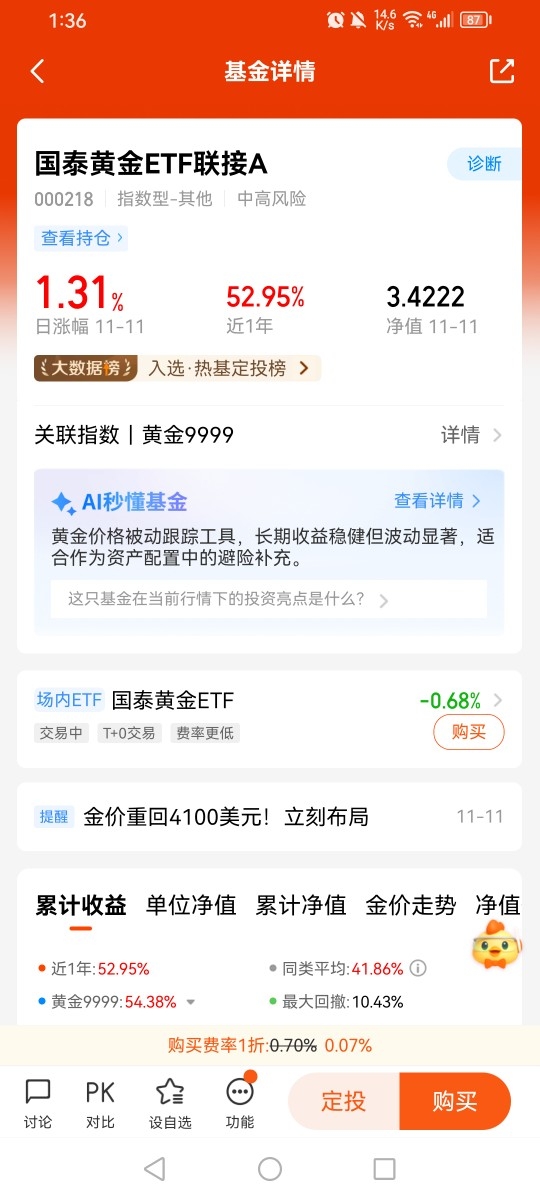 选择国泰黄金ETF联接A,正是看中其精准把握黄金红利的核心优势。这只基金采用被动管理策略,90%以上资产紧密跟踪黄金ETF,有效规避了股票、债券等资产的波动风险,能纯粹捕捉金价上涨收益。基金经理艾小军任职近十年,历史年化收益超10%,累计回报更是可观,专业管理让投资更放心。同时,其低费率优势明显,持有成本远低于同类产品,长期下来能为收益省下不少“隐形开支”,而0.1元起购的低门槛,也让普通投资者能轻松参与黄金资产配置。