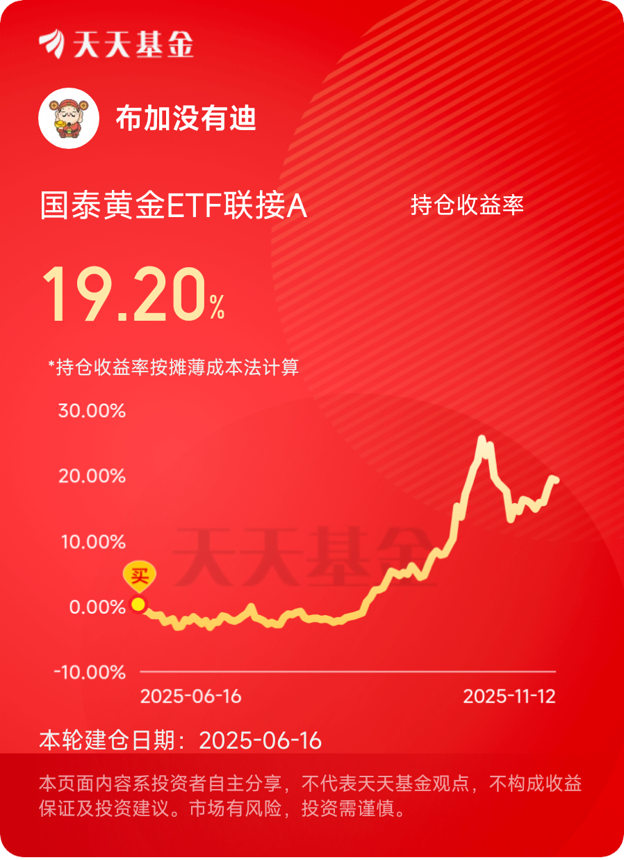 基于对黄金市场长期趋势的判断和基金的优质属性,我会坚定持有国泰黄金ETF联接A,并在市场合适的时机持续加仓。我深知黄金价格不会一直单边上涨,短期可能出现回调,但在全球经济不确定性未消、降息周期开启预期明确、央行购金趋势不改的背景下,黄金的长期上涨逻辑并未改变。对于普通投资者而言,与其纠结于短期点位波动,不如以长期视角布局,通过分批加仓的方式摊薄成本、把握趋势。未来,我将继续密切关注美联储政策动向、地缘政治局势和全球央行购金数据,在市场回调时择机增持,让这款基金在我的资产配置中持续发挥保值增值的核心作用,在黄金的长期行情中收获更丰厚的投资回报。@国泰基金 #晒收益#