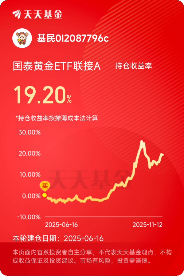 如今,我对国泰黄金ETF联接A的持有决心愈发坚定,也期待着与更多投资者一起,以长期投资的心态,陪伴这只基金成长,在黄金资产的长期机遇中,收获属于自己的稳健收益。相信时间会证明,选择国泰黄金ETF联接A,是一次正确且值得的投资决策。@国泰基金 #晒收益#