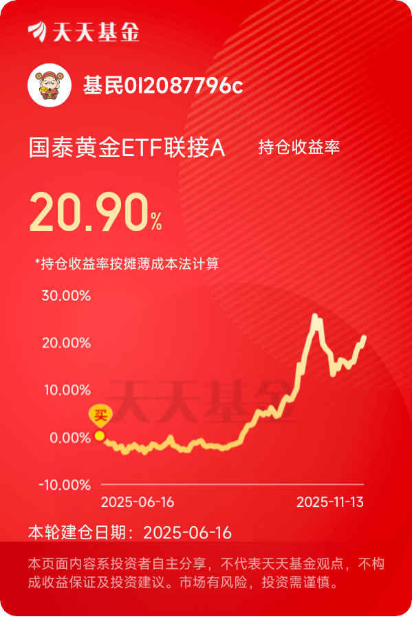 作为一名受益良多的持有人,国泰黄金ETF联接A不仅为我带来了可观的投资收益,更让我在复杂的市场环境中找到了一份安心。它的优质业绩、清晰逻辑、舒适体验,都让我坚定了长期持有的决心。我相信,在多重利好因素的支撑下,这只基金的未来前景依然广阔,也期待有更多投资者能发现它的价值,通过合理配置实现资产的稳健增值。@国泰基金 #晒收益#