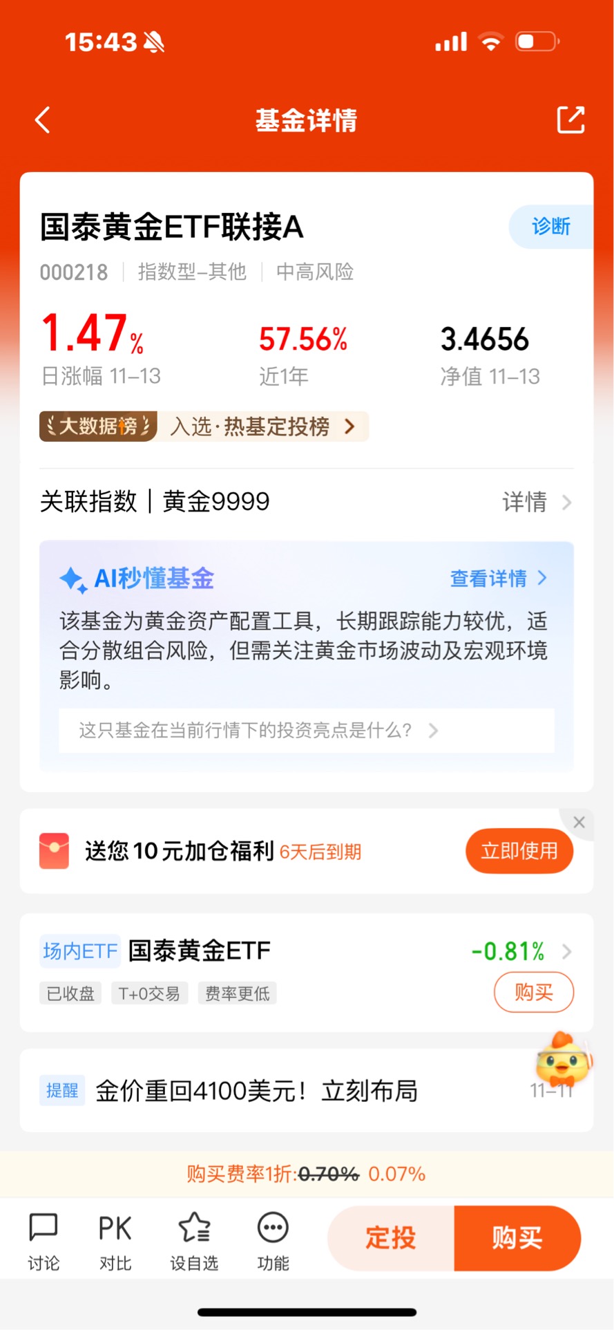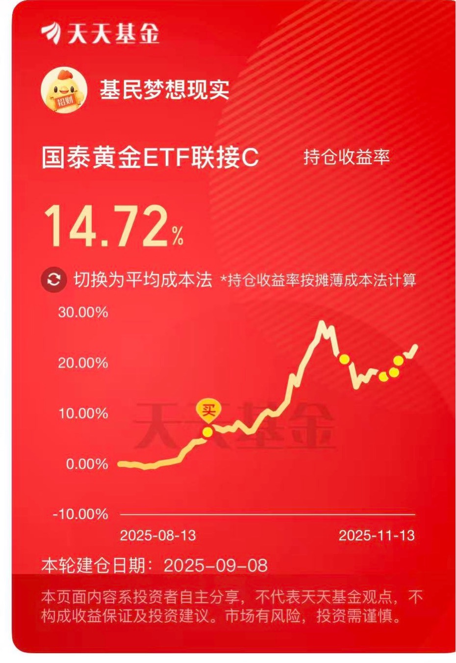 总之,在当前不确实市场环境中,国泰黄金ETF联接A为投资者提供了低门槛、高透明度的参与方式。对于稳健型投资者我还是建议定投方式参与,省心又安心。投资不是比谁赚得快,而是比谁走得稳—我目前持有国泰黄金ETF联接C我感受的不仅是收益,更是对未来踏实感。@国泰基金