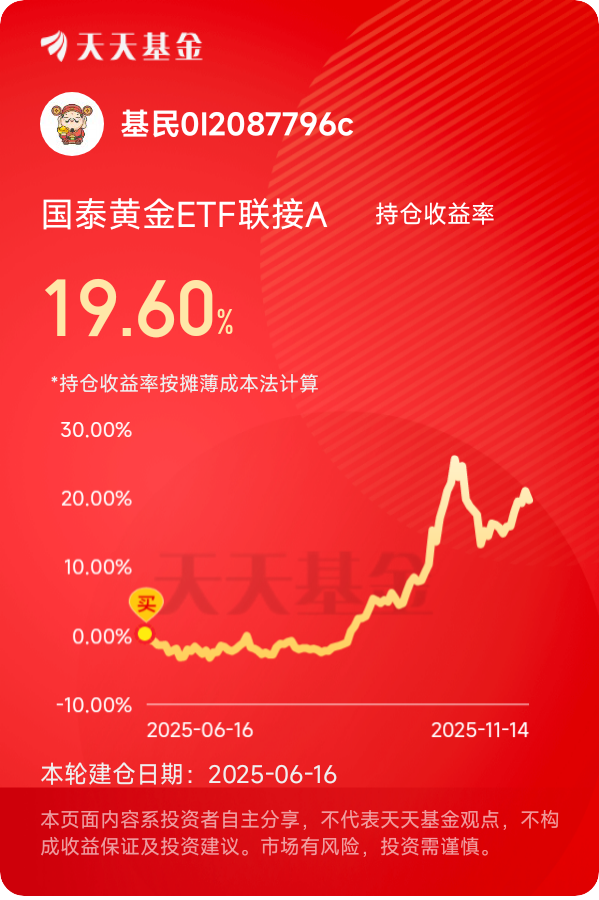 如果你也在寻找一款能兼顾收益与安心的理财工具,如果你认同黄金资产的长期价值,那么国泰黄金ETF联接A绝对值得你重点关注。不妨从小额定投开始,逐步感受它的投资魅力,相信你也会和我一样,被它的稳健表现和优质体验所打动。在未来的投资道路上,我将继续与国泰黄金ETF联接A同行,坚定长期持有、持续加仓,也期待与更多投资者一起,把握黄金资产的长期机遇,在稳健理财的道路上稳步前行,收获属于自己的财富增值成果。@国泰基金 #晒收益#