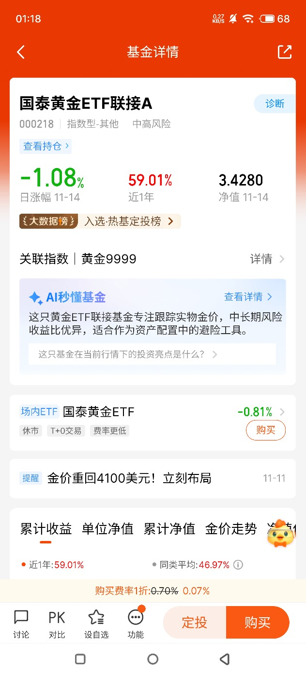 作为国泰黄金ETF联接A的忠实持有人,我对黄金投资的长期逻辑深信不疑,也始终坚定持有这只陪伴我穿越市场周期的优质基金。在起伏不定的投资路上,它不仅是我资产组合的“安全垫”,更是我捕捉长期收益的可靠伙伴。
