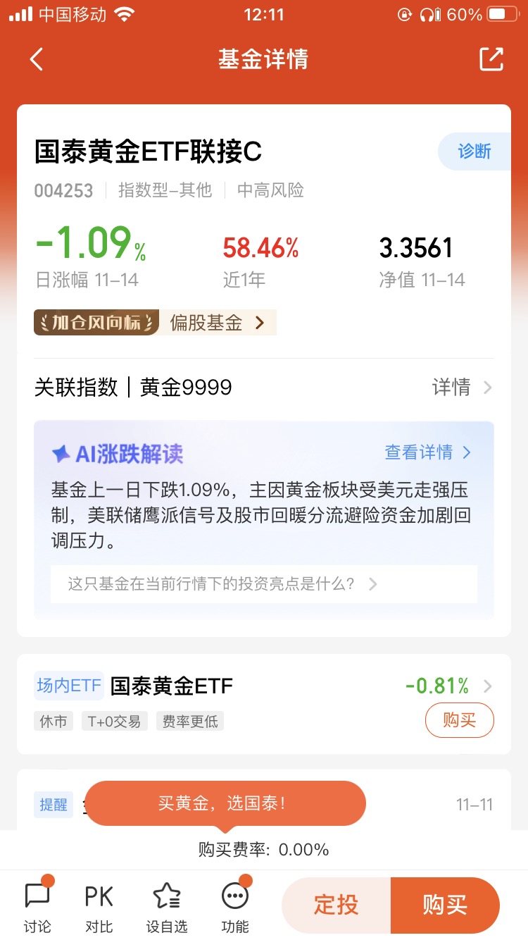 #观点搭子团火热招募中!# 本周五$国泰黄金ETF联接A$ 净值 3.4280,日跌 1.08%,C 类(004253)同步随金价震荡回调。核心原因是短期获利盘了结,叠加美联储降息预期小幅摇摆,压制了黄金短期表现。但长期看,全球央行持续购金、地缘风险未消,仍为金价提供强支撑。