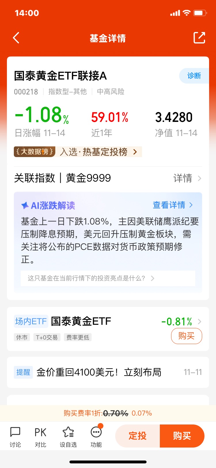 在众多的黄金投资产品中,我特别关注国泰黄金ETF联接A(000218)。这是一只成立于2016年4月13日的指数型基金,由老牌基金公司国泰基金负责管理,托管行是中国工商银行,安全性有充分保障。
