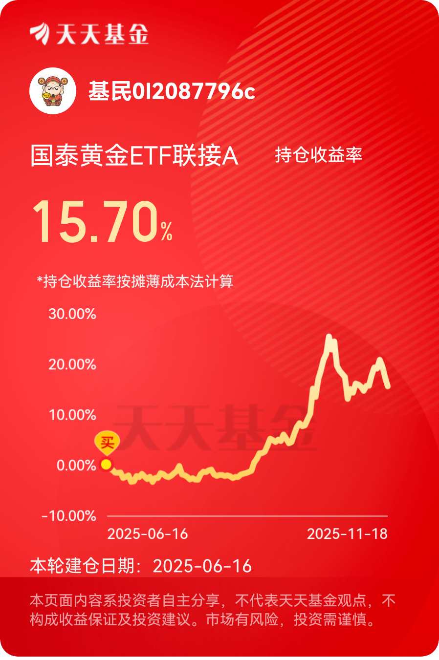 作为国泰黄金ETF联接A的长期持有人,从最初小额尝试到如今重仓配置,这只基金始终用稳健的表现和可观的收益,诠释着优质资产的投资价值。在市场波动频繁的当下,它不仅成为我资产组合中的“压舱石”,更让我看到了黄金赛道的长期潜力,如今我不仅坚定持有,更计划持续加仓,也想把这份靠谱的投资选择分享给广大投资者。