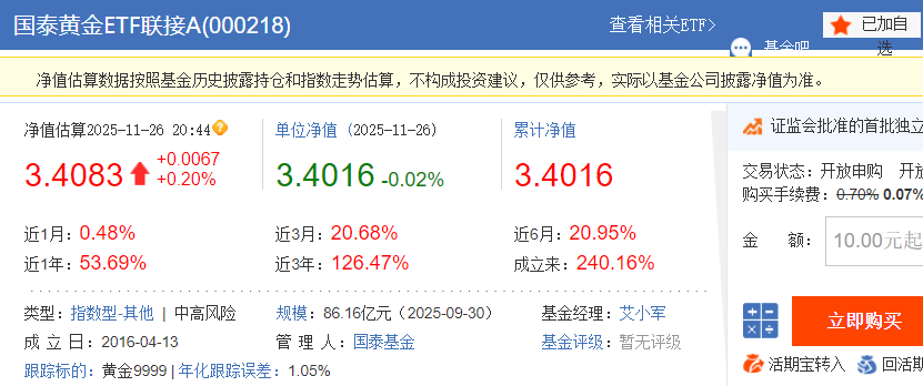 截至 2025 年 11 月 26 日,国泰黄金 ETF 联接基金的跟踪误差表现如下: