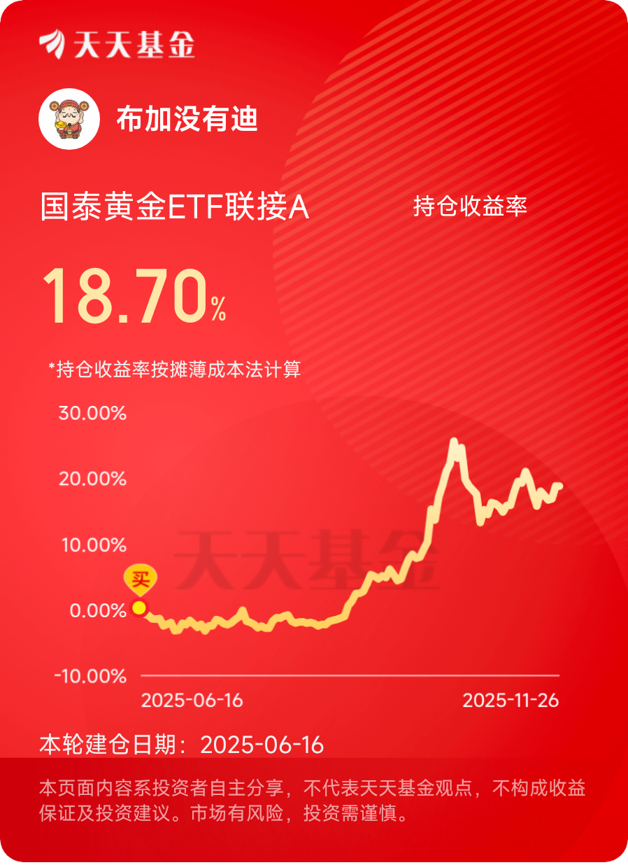 展望未来,黄金市场的长期投资价值依然突出。全球经济不确定性仍将持续,地缘政治风险常态化,央行购金趋势不改,叠加美元信用体系的结构性变化,黄金价格中枢有望持续抬升。短期市场可能出现震荡回调,但这正是逢低加仓的好时机。基于对黄金赛道长期向好的判断,以及对国泰黄金ETF联接A产品实力的认可,我会继续将其作为资产配置中的核心标的坚定持有。后续将延续"定期定投+逢低加仓"的策略,每月固定投入锁定长期收益,在金价回调时择机追加资金摊薄成本,充分把握这一波黄金牛市的投资机遇。相信在多重利好因素的支撑下,国泰黄金ETF联接A将持续为持有人带来稳健的长期回报。@国泰基金 #晒收益#
