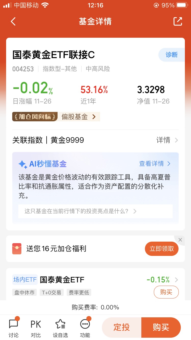 #观点搭子团火热招募中!# 截至11月27日午盘,国泰黄金ETF联接A(000218)实时净值3.4015,实时跌幅约-0.03%;联接C(004253)同步波动,实时净值3.3297,跌幅相近,二者短期走势高度趋同。