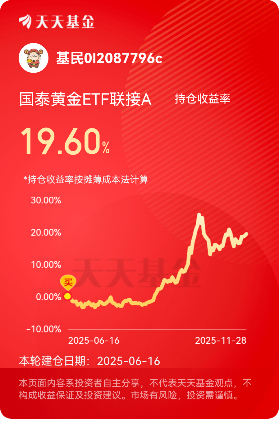在此也想把这只基金推荐给广大投资者。如果你是风险偏好适中、追求资产稳健增值的投资者,或是想为自己的投资组合增加避险资产、分散风险,国泰黄金ETF联接A绝对值得考虑。它运作透明、标的优质、配置价值突出,无论是作为核心持仓还是卫星配置,都能在资产组合中发挥重要作用。当然,投资有风险,建议大家根据自身风险承受能力和投资周期理性布局,但相信只要长期持有,就能感受到黄金资产的独特魅力,收获稳健的投资回报。