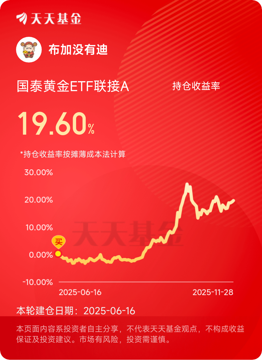 市场短期波动是常态,但黄金的长期价值逻辑并未改变。国泰黄金ETF联接A以其精准的跟踪效果、便捷的操作方式、稳健的收益表现和低廉的投资成本,成为普通投资者把握黄金长牛机遇的理想工具。过往的持有体验让我对其充满信心,未来我将始终坚守长期投资理念,坚定持有并择时加仓,让这只优质基金持续为资产增值保驾护航。