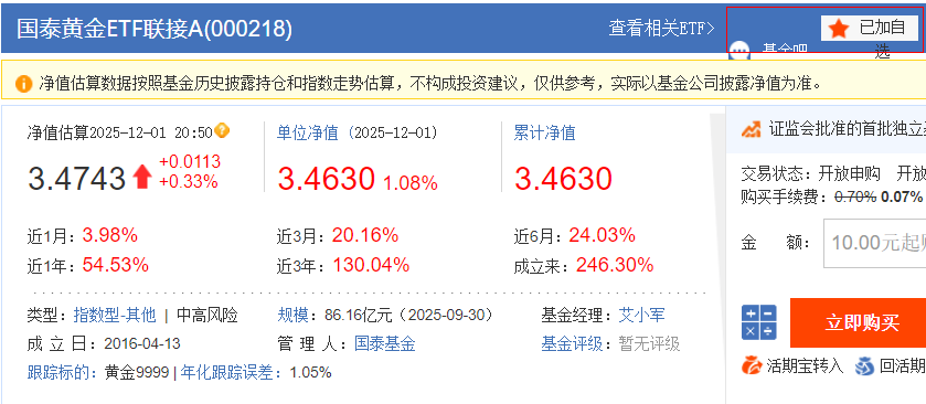 核心仓位 (70%) 配置国泰黄金 ETF 联接 A (000218):长期持有成本优势明显,适合 1 年以上投资