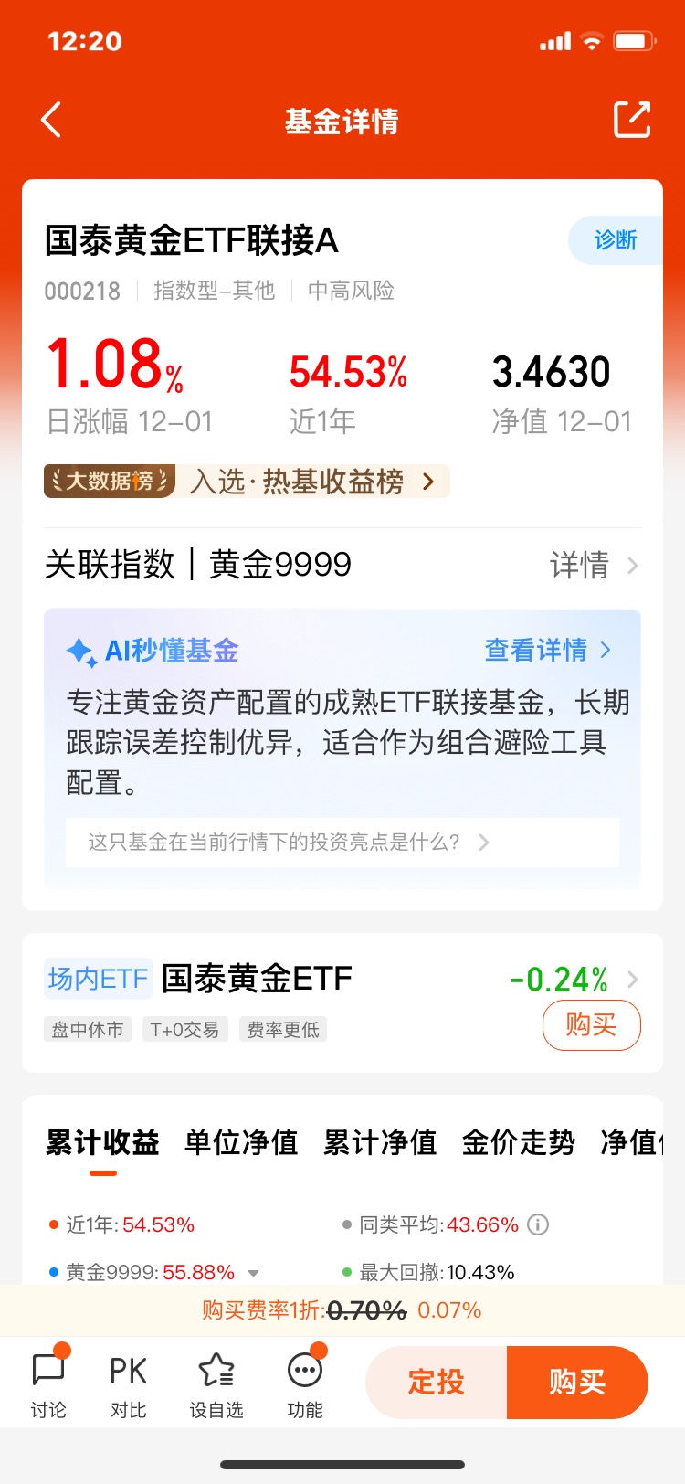 在众多的黄金投资产品中,我特别关注国泰黄金ETF联接A(000218)。这是一只成立于2016年4月13日的指数型基金,由老牌基金公司国泰基金负责管理,托管行是中国工商银行,安全性有充分保障。