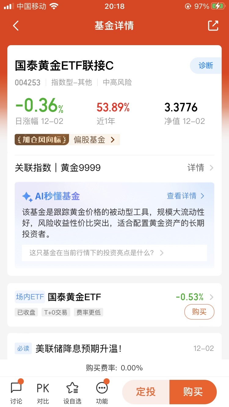 #观点搭子团火热招募中!# 国泰黄金 ETF 联接 A (000218) 净值 3.4506,国泰黄金 ETF 联接 C (004253) 净值 3.3776,二者日涨跌幅均为 -0.36%。这是因当日金价高位回落,且市场风险偏好回暖、日央行加息预期升温,压制了金价上行。不过长期看,美联储 12 月降息概率近 90%,仍利好金价。