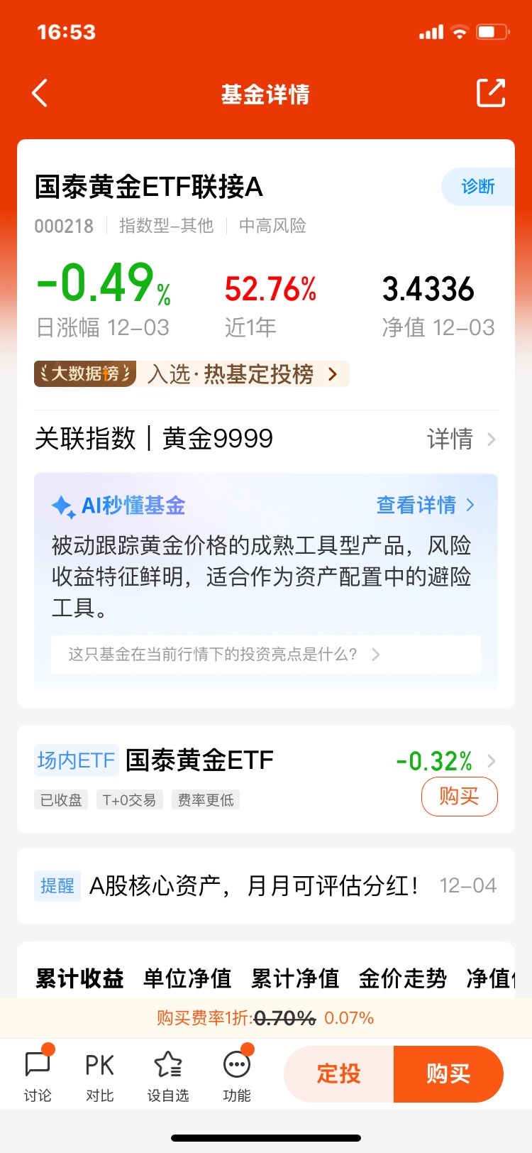 总结来说,在市场波动加剧的当下,我偏好黄金并非因为它能一夜暴富,而是因为它能提供一份从容。无论是作为避险工具,还是长期价值存储,黄金都展现出了独特的魅力。而像$国泰黄金ETF联接A(OTCFUND|000218)$这样的产品,则让普通投资者能以便捷的方式参与其中。投资路上,少一些跟风,多一点坚守,或许才是长久之道。毕竟,真正的“抗震”,不在于躲过每一次震荡,而在于拥有能经受震荡的资产。黄金,正是这样一种选择。@国泰基金
