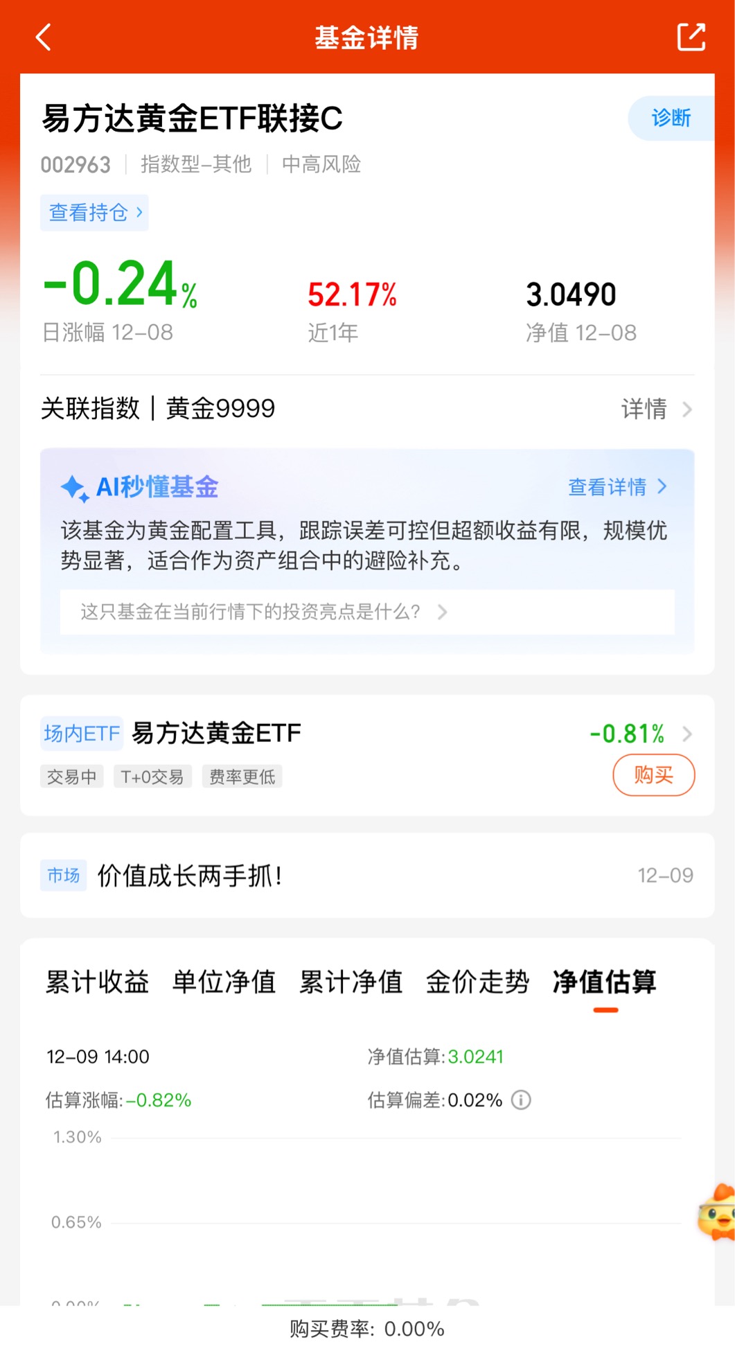 今日黄金市场震荡下跌,短期波动受降息预期变化及地缘局势扰动。但$易方达中证沪深港黄金产业股票指数发起式C$