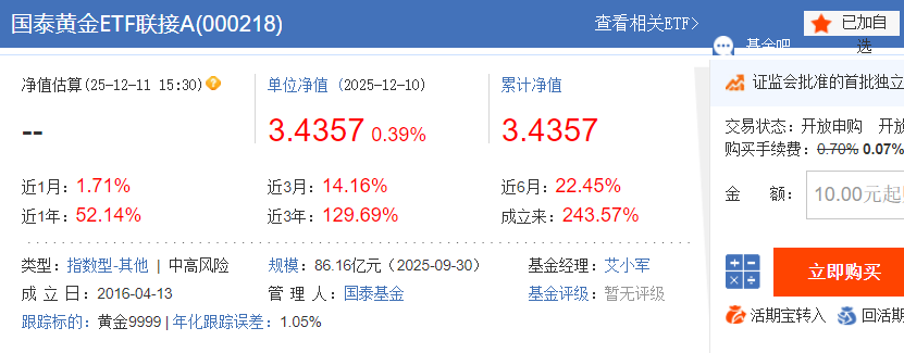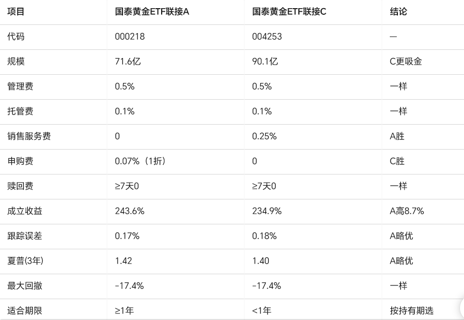 2. 国泰黄金ETF联接A(000218)和C(004253)都是“黄金9999”复制器,年化跟踪误差0.18%,吊打同行。