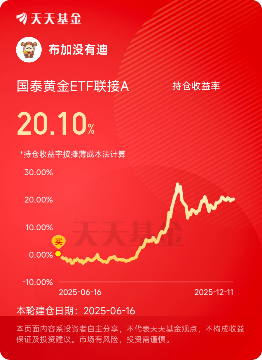 在充满不确定性的投资市场中,选择一只逻辑清晰、表现稳健、体验优良的基金尤为重要。国泰黄金ETF联接A以黄金资产的强趋势为依托,凭借纯粹的投资标的、便捷的参与方式和稳健的业绩表现,成为我资产配置中不可或缺的一环。未来,无论市场风云如何变幻,我依然会坚守这份对黄金赛道的信心,以长期持有的耐心和理性加仓的策略,陪伴基金穿越周期,收获时间的馈赠。对于追求稳健配置的投资者而言,这只基金无疑是拥抱黄金价值的优质选择。@国泰基金 #晒收益#