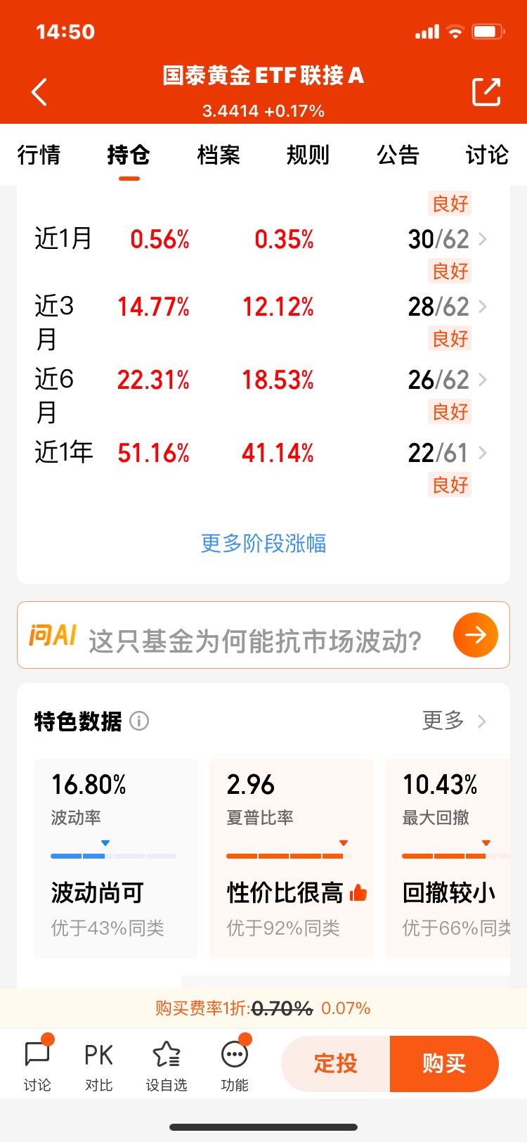 现在,我想重点$国泰黄金ETF联接A(OTCFUND|000218)$。这支基金是一只指数型基金,跟踪的是黄金价格指数,对我来说,它是个便捷的投资工具,尤其适合初入职场的人。首先,从管理团队和产品矩阵来看,国泰基金作为老牌基金公司,拥有丰富的资产管理经验和稳定的产品线,这为$国泰黄金ETF联接A(OTCFUND|000218)$提供了强大的后台支持。基金产品底层资产主要配置在黄金现货或相关衍生品上,业绩比较基准通常是上海金价或类似指数,这意味着它紧密跟随金价波动,透明度高,避免了主动管理基金可能带来的风格漂移风险。