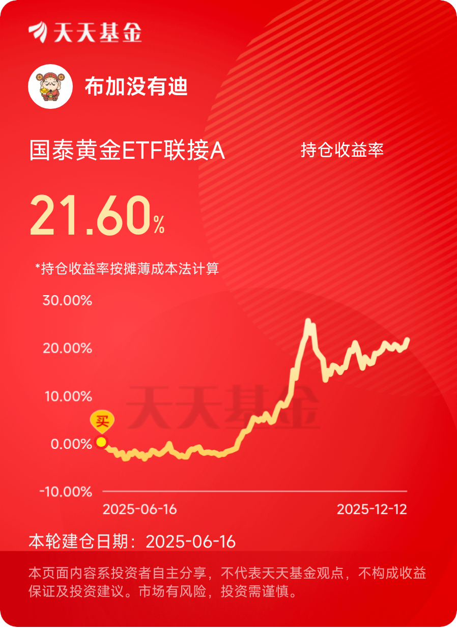 在充满不确定性的投资市场中,找到一只逻辑清晰、运作稳健、体验优质的基金实属不易。国泰黄金ETF联接A既背靠黄金长牛的时代风口,又具备自身的产品硬实力,更用持续向好的收益证明了其投资价值。未来,我将继续坚守这份投资选择,在长期持有中陪伴基金成长,让这只优质基金成为资产增值路上的可靠伙伴。@国泰基金 #晒收益#