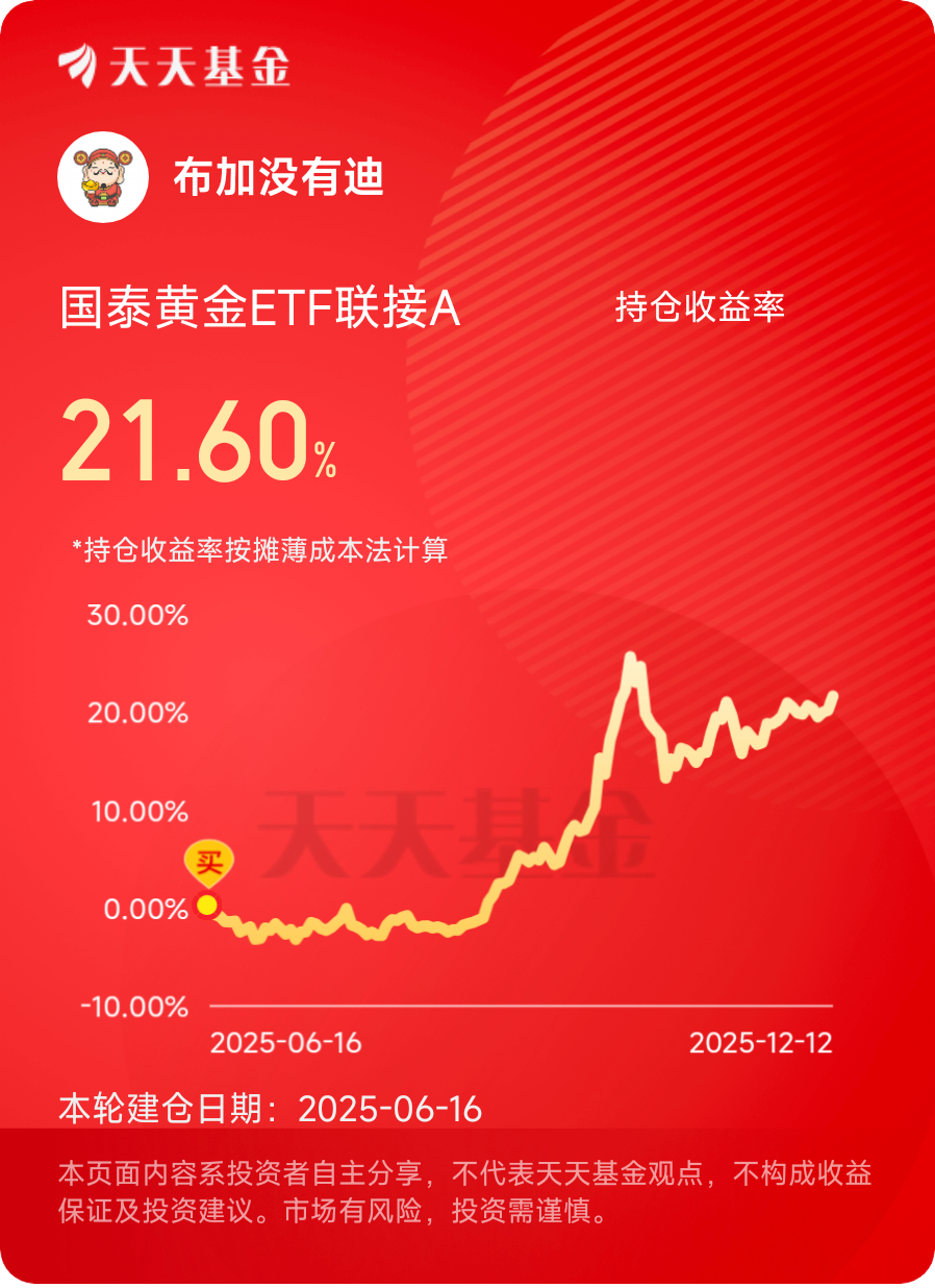 投资是一场长期的修行,唯有坚守正确的方向、保持足够的耐心,才能穿越市场迷雾。对于国泰黄金ETF联接A,我不会因短期波动而动摇,也不会因阶段性收益而盲目跟风,而是会以理性的心态坚定持有,并根据市场节奏择时加仓,让这只优质基金在我的资产组合中持续发挥“压舱石”和“增值器”的双重作用,在不确定的市场中锁定确定的长期价值。在黄金资产的长期赛道上,相信时间会见证坚守的力量,也会回馈每一份理性的选择。#晒收益#