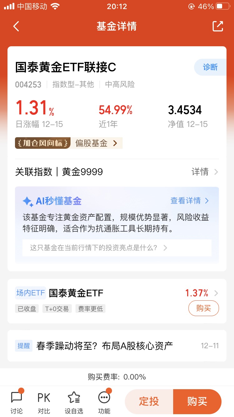这两只基金就差申购赎回费,长期拿选 A,短期波段选 C。我手里持着 C 类,打算继续拿着不动。机构都看高 2026 年金价到 4900 美元,央行也在持续增持,长期逻辑没破。虽然短期可能震荡,但现在市场波动大,黄金作为底仓能稳组合,没必要纠结单日涨跌。@国泰基金