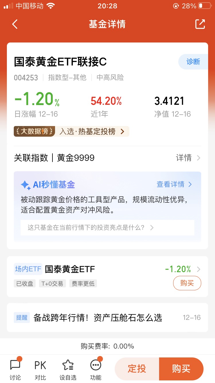 #观点搭子团火热招募中!# $国泰黄金ETF联接A$ $国泰黄金ETF联接C$ 对应黄金 ETF(518800)收跌 1.20%,主力资金净流出 651.08 万元,大概率拖累二者当日净值。二者 12 月 15 日净值均为 1.31% 上涨,A 类净值 3.5285,C 类 3.4534,近 12 个月涨幅均超 54%。