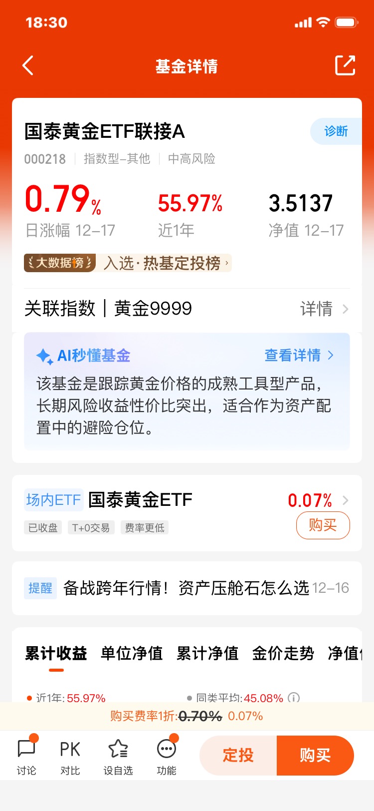 谈到具体投资工具,我个人重点关注指数型基金,比如$国泰黄金ETF联接A(OTCFUND|000218)$。这类产品通过跟踪黄金价格指数,让投资者以低成本、高流动性的方式参与黄金市场。首先,从管理团队和产品矩阵看,国泰基金在指数投资领域积累深厚,产品线覆盖广泛,为这只基金提供了扎实的运营支持。基金经理艾小军拥有丰富的量化投研经验,注重风险控制和纪律性执行,这恰好符合指数基金“被动跟踪、减少人为干扰”的特点。