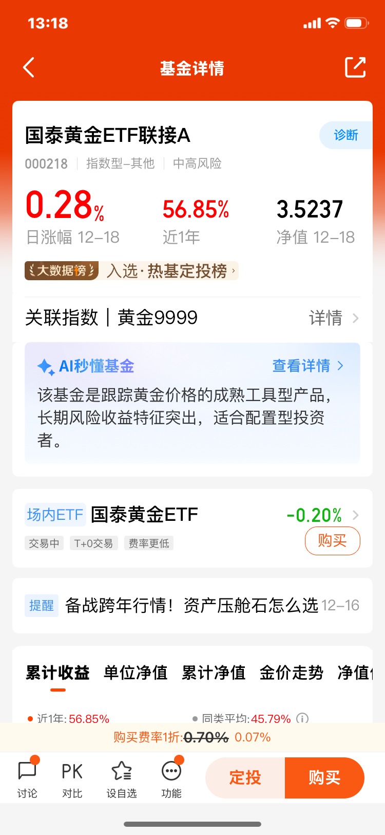 在众多的黄金投资产品中,我特别关注国泰黄金ETF联接A(000218)。这是一只成立于2016年4月13日的指数型基金,由老牌基金公司国泰基金负责管理,托管行是中国工商银行,安全性有充分保障。