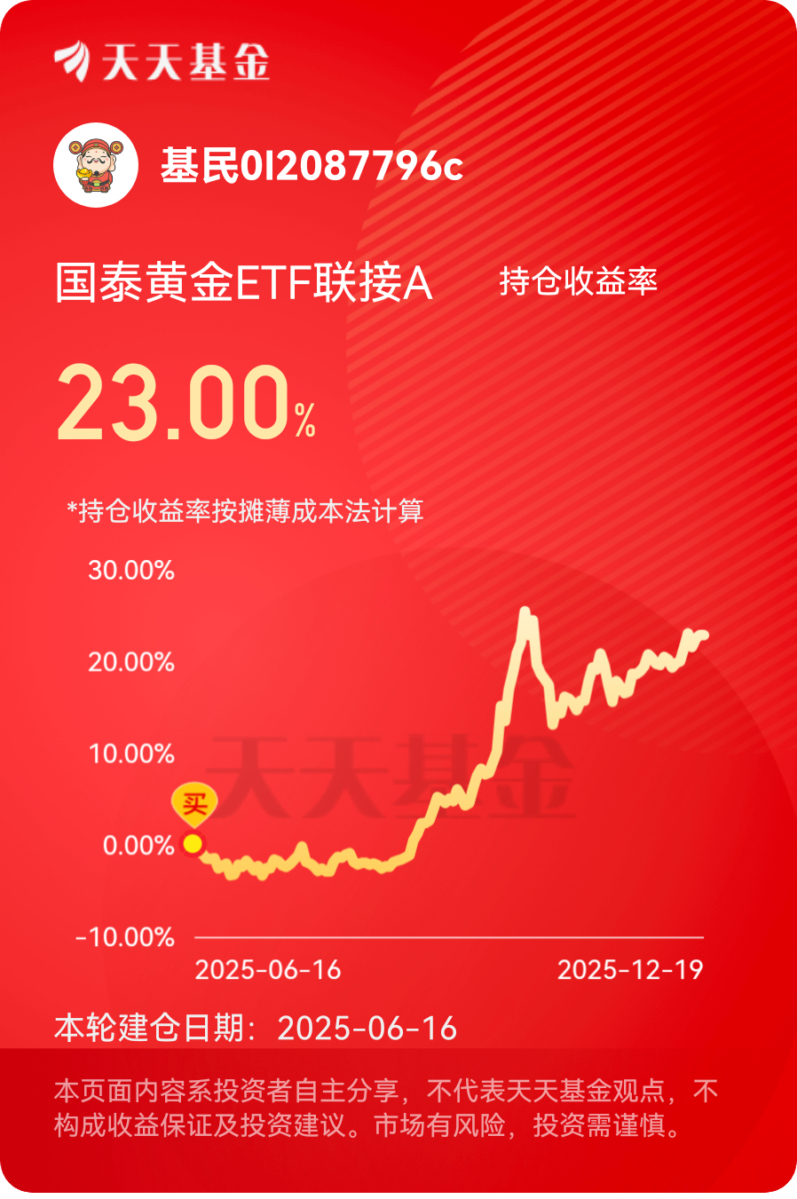 在此,我真心向广大投资者推荐国泰黄金ETF联接A。如果你是追求稳健收益、担心市场波动的理财新手,它能让你轻松参与黄金投资;如果你是希望优化资产配置、提升组合抗风险能力的资深投资者,它能成为你资产组合的“压舱石”。只要你认可黄金的长期投资逻辑,愿意保持耐心持有,相信国泰黄金ETF联接A一定会给你带来满意的投资回报,成为你理财路上的安心之选。@国泰基金 #晒收益#