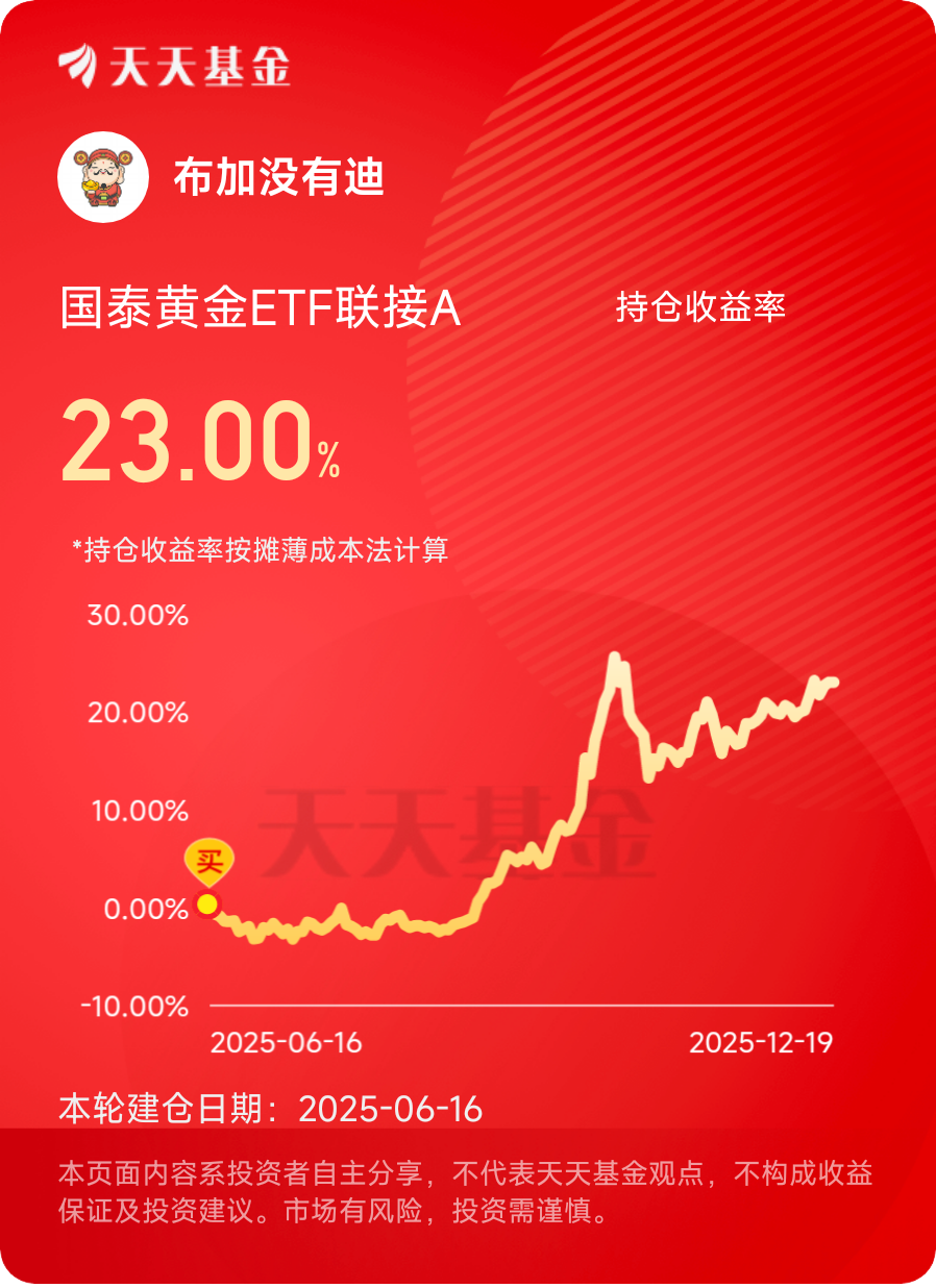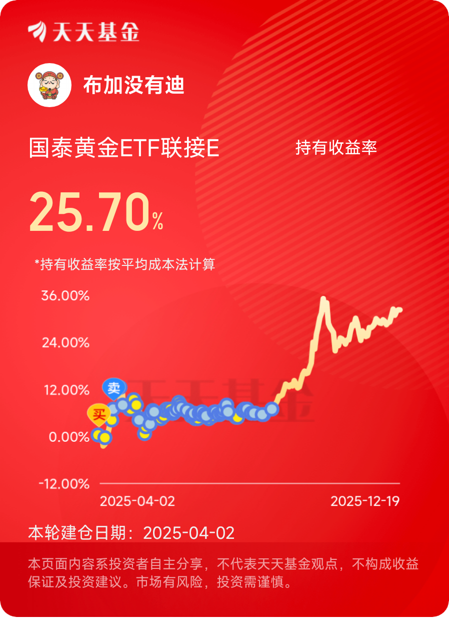 基于对黄金赛道的坚定看好,以及对这两只基金投资价值的深度认可,我始终坚持“长期持有+择时加仓”的策略。在金价阶段性回调时,我会果断追加资金,摊薄持仓成本;在市场平稳期,则通过定投的方式稳步积累份额。我坚信,黄金的长期投资价值不会因短期市场波动而改变,而国泰黄金ETF联接A与E这对“黄金搭档”,也将继续陪伴我穿越周期。未来,我会继续坚定持有这两只基金,以时间换空间,在黄金赛道的长期机遇中,收获属于自己的稳健财富增值。@国泰基金 #晒收益#