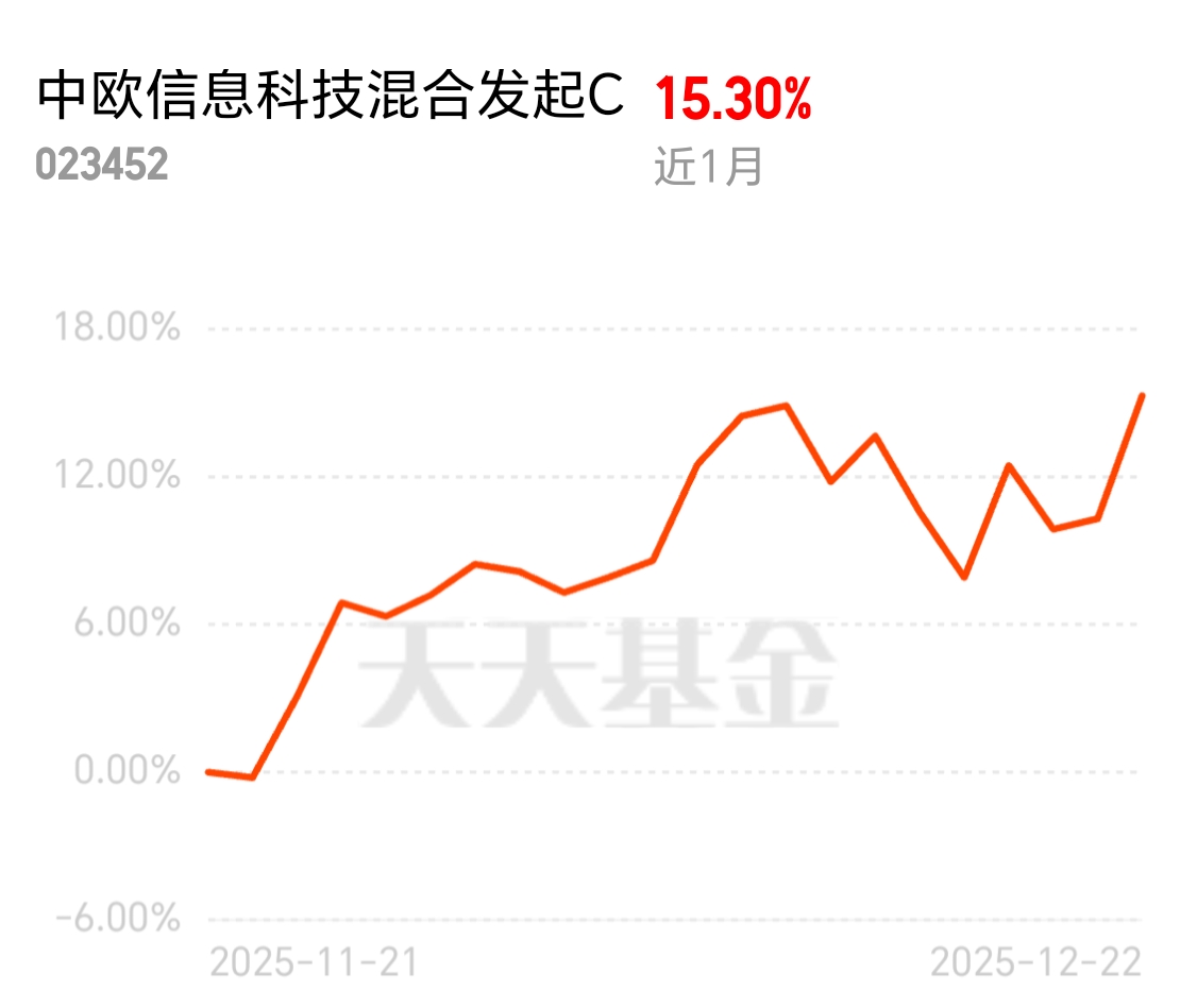 消费电子、光模块成市场香饽饽,科技板块强势反弹,中欧信息科技混合发起 C 近 1 个月 15.30%,聚焦核心资产抓上涨机会。$中欧信息科技混合发起C$