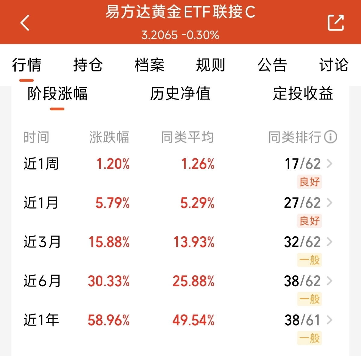昨夜调整的黄金,白银纷纷开启了反弹。所以来看短线的调整对长期的走势还是影响不大。而且目前央行还在增持黄金。美元表现的还是比较弱。在美联储货币宽松周期下,黄金未来的成长表现,我还是依然看好。今天我决定继续布局$易方达黄金ETF联接C$ 就是聚焦黄金基金,