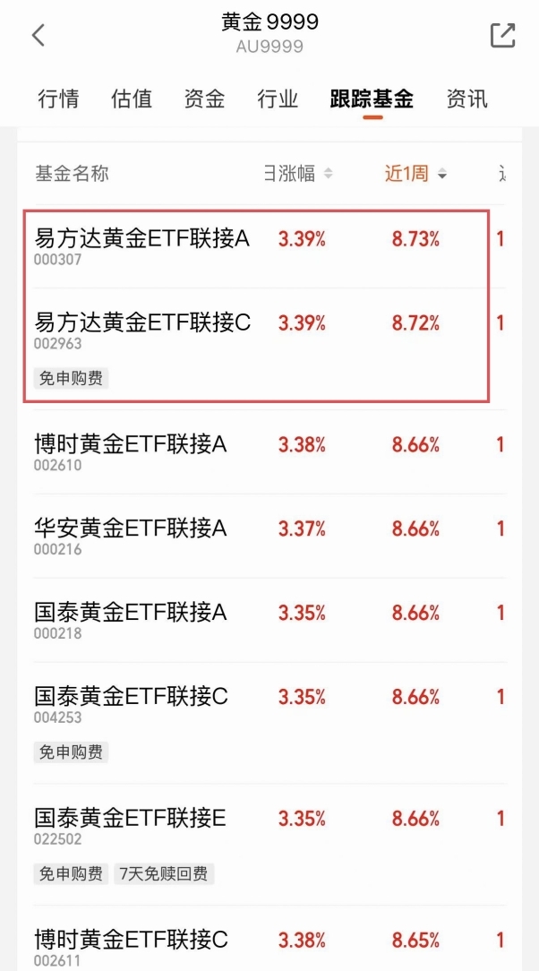 黄金真是太强了。国际金价外盘盘中触及5600美元,真是非常强势。由于近年来国际局势放不稳,加之关税战频发,资金的避险情绪持续升温,才导致国际金价步步高升。$易方达黄金ETF联接C$ 易方达黄金近一周表现还是非常优秀的,涨幅8.72%。在同类产品中,收益遥遥领先,如近期有小伙伴想入手,可以关注一下哦。