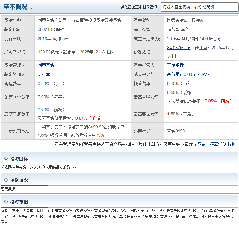 该基金运作成本处于同类产品中等偏低水平,年化管理费仅0.50%,托管费0.10%,综合运作费率约0.61%,无需承担实物黄金的存储、保管等额外费用。同时,申购费率按金额阶梯式收取,持有超过两年赎回费为0,对于长期持有(1-3年)的投资者而言,能节省大量费用成本,进一步提升实际收益。此外,基金规模充足,截至2025年12月31日总资产规模达120.03亿元,避免了迷你基金的清盘风险,流动性有可靠保障。