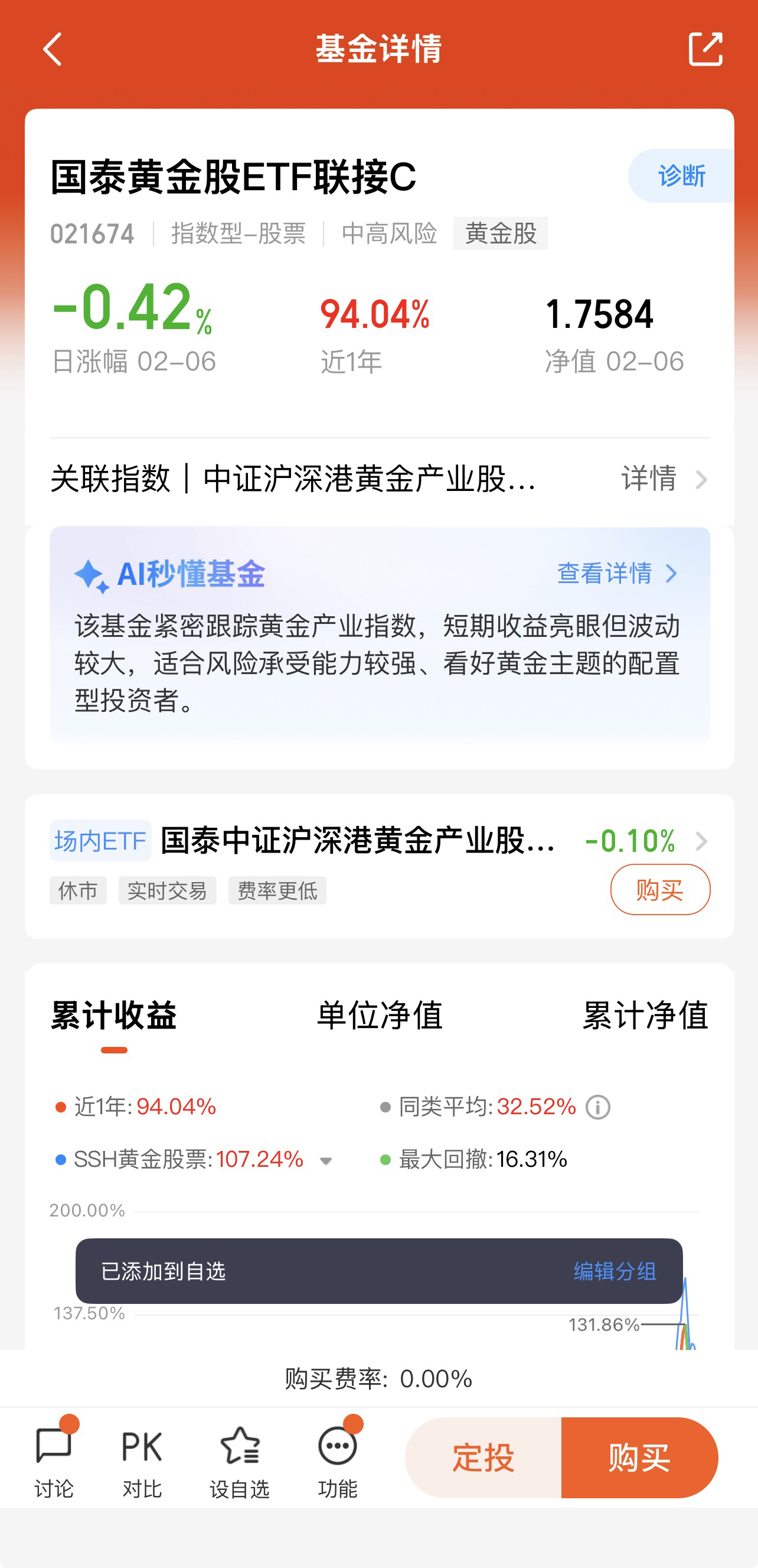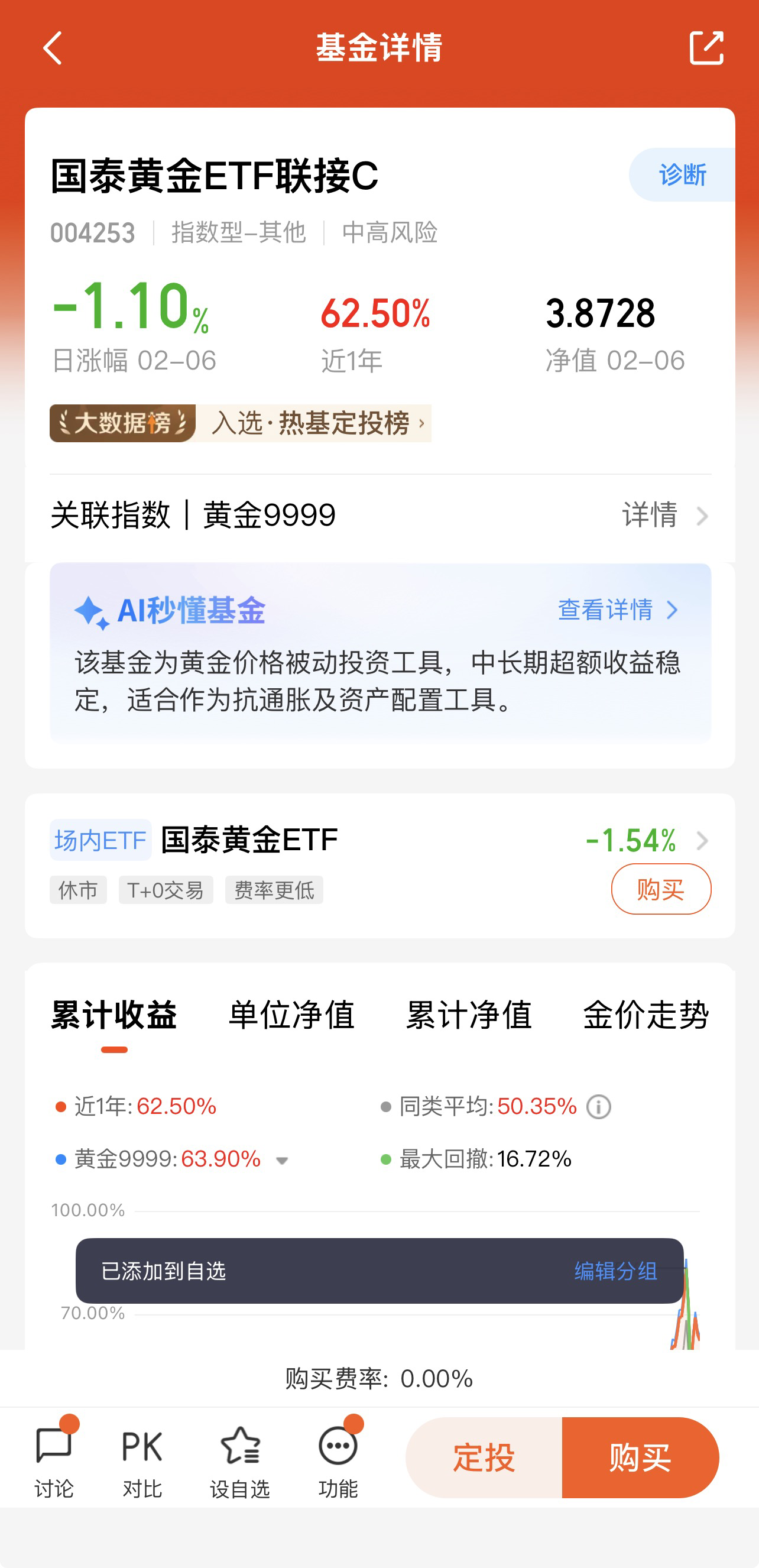 不同于实物黄金需要保管、回收等繁琐流程,也无需开通证券账户交易黄金ETF,该基金作为场外联接基金,可通过普通基金申购渠道操作,申赎便捷,适合没时间盯盘的上班族、投资新手等群体。同时,其投资门槛低至10元起投,打破了黄金投资“高门槛”的壁垒,让普通人也能分享金价波动带来的收益,无需承担大额资金投入压力。此外,基金托管于中国工商银行,由老牌国泰基金管理,运作规范,安全性有充分保障。