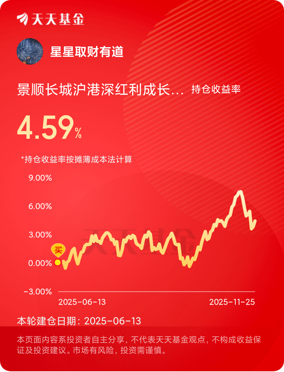 连涨两天了,看趋势今天也是涨的,震荡市场下适合配点红利来平衡收益#今年买基金赚了多少钱?# $景顺长城沪港深红利成长低波指数E$ #晒收益#
