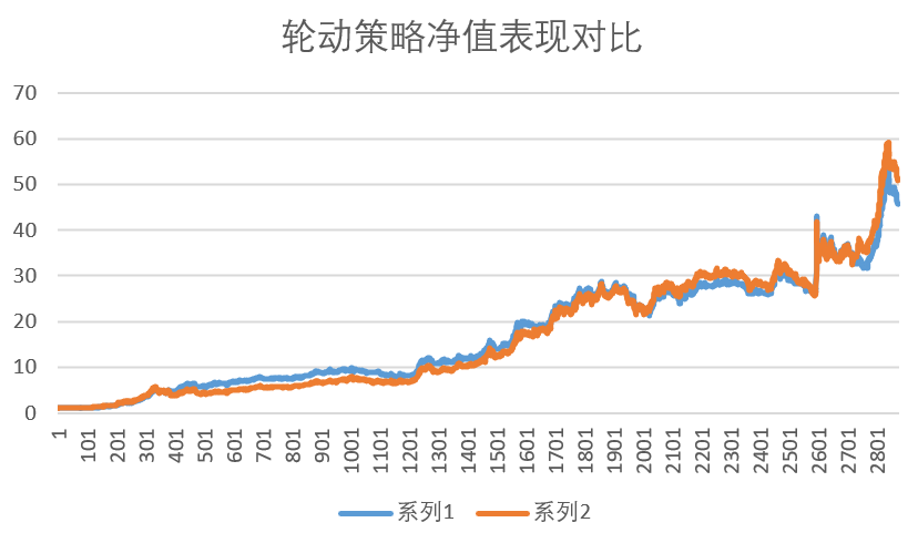 以下是原版轮动策略(系列二)和改动版轮动策略(系列一)的净值对比情况: