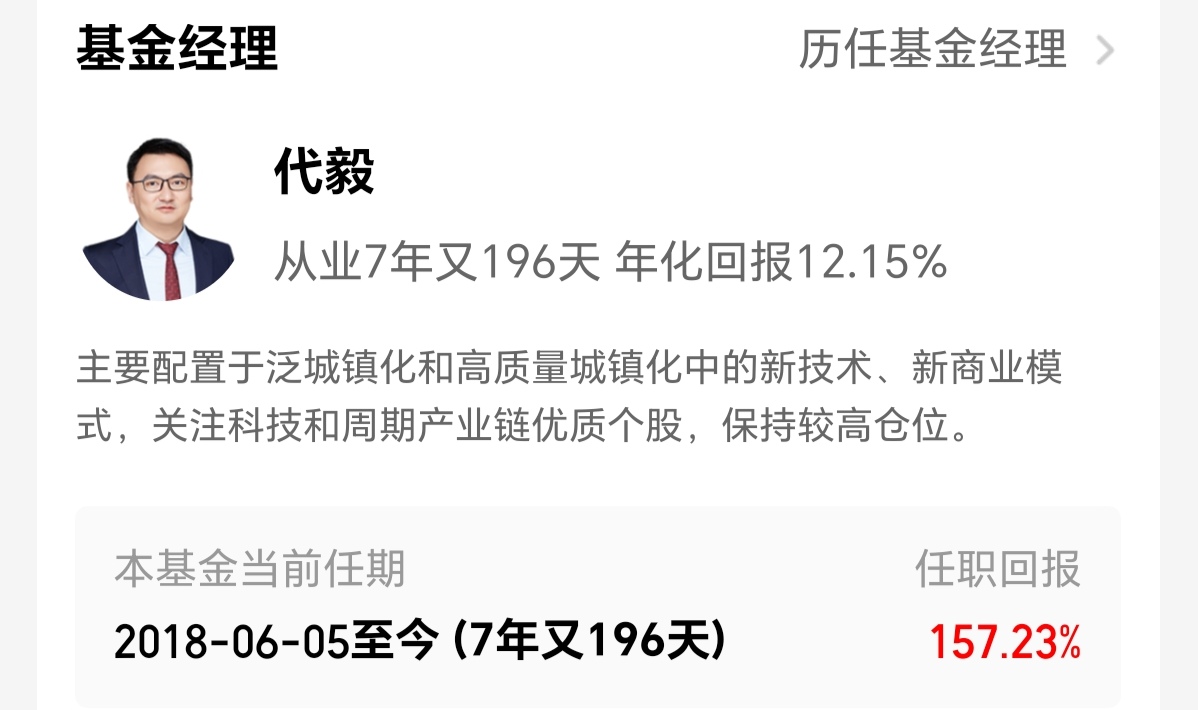 代经理任职经验丰富,聚焦通信、电子等城镇化相关的科技领域,管理该基金6年的时间,过往业绩优秀,同类排名靠前,任职回报率高达157.23%,近1年的收益100.22%,远优于同类均值和大盘指数,展现了代经理较强的择时能力和持续在高景气赛道里挖掘成长性强确定性高的标的能力。