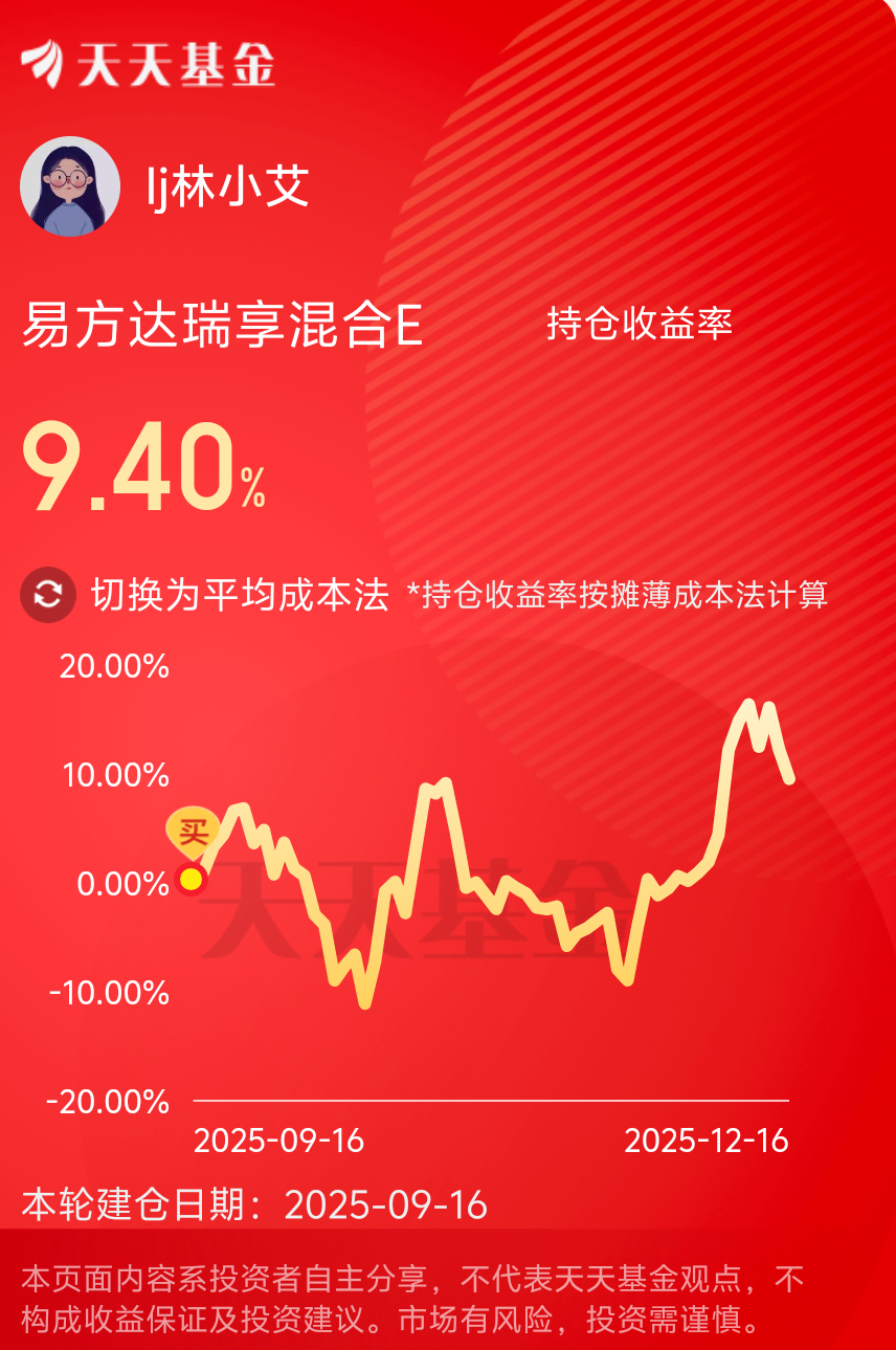 今日市场行情好转,我A在午后大爆发,指数集体走强,CPO板块带领科技板块再次起飞,我鸡窝中的$易方达瑞享混合E$ (001438)目前估值已经上涨了7%,走势非常的猛,可见其实力很强,只要有东风立马反弹。我对武总还是非常认可的,主要他能提前进行布局,其调仓水平也很高,这样我们跟这他才能多吃肉!